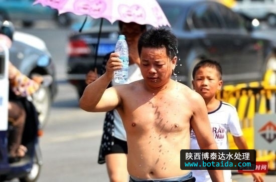 2014年7月22日,實拍濟南40℃高溫市民百態(tài) 礦泉水澆頭王府池子游泳 圖為濟南市民街頭用礦泉水澆頭解暑。