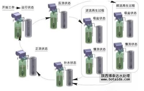 ④快沖洗:為了將殘留的鹽徹底沖洗干凈,要采用與實際工作接近的流速,用原水對樹脂進(jìn)行沖洗,這個過程的后出水應(yīng)為達(dá)標(biāo)的軟水。一般情況下,快沖洗過程為5-15分鐘。的軟化能力下降,可以用氯化鈉溶液流過樹脂,此時溶液中的鈉離子含量高,功能基團(tuán)會釋放出鈣鎂離子而與鈉離子結(jié)合,這樣樹脂就恢復(fù)了交換能力,這個過程叫作"再生"。